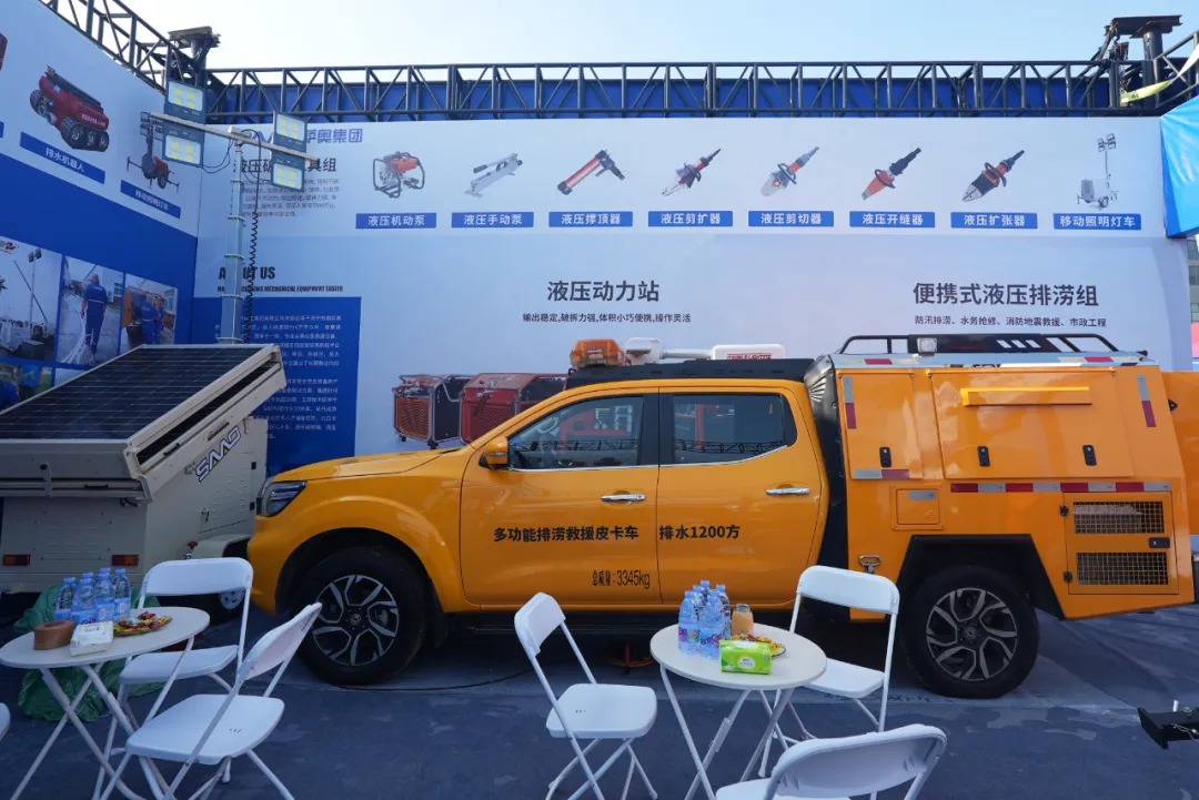 展会期间,萨奥集团重点展示了多功能排涝救援皮卡车、1200方履带式排水机器人和液压动力站、液压混凝土破拆八件套、移动照明灯车等核心产品。